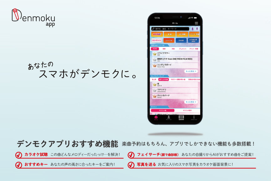 さらに、デンモクアプリ限定機能の「楽曲のメロディー確認」や「スマホ写真をカラオケ背景に変更」などの機能もありお勧めです!